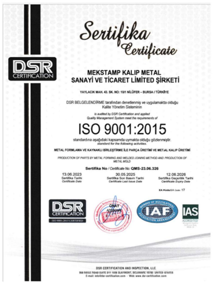 MEKSTAMP KALIP METAL, 2016 yılında 1000 m2 kapalı alan 30 kişilik kadrosuyla Bursa Nilüfer OSB’de faaliyete başlamıştır. Tecrübeli kadrosuyla yüksek teknoloji makine ve yazılım kapasitesiyle müşterilerimize soğuk saç şekillendirme kalıpları ve özel üretim hatlarının devreye alımı prototip ve ürün geliştirme süreçlerinde hizmet etmekteyiz.